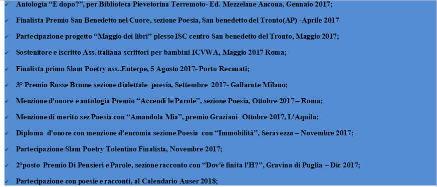 Nato nel Parco dei Monti Sibillini il 4 Agosto 1987, precisamente ad Amandola, fin da quando avevo pochi anni, leggo dapprima fumetti e poi libri sempre più impegnati. Mi diplomo in Ragioneria e conseguo poi la laurea in Economia del Territorio e del Turismo. Inizio nel 2011 un corso di scrittura creativa con il quale scopro una passione celata dentro di me e che va stimolata. I tanti libri divorati negli anni sono una fucina di creatività. Così scrivo. Partecipo con devozione ad una Antologia: “Il cerchio della memoria”. Un lavoro che grazie allo scrittore Vittorio Graziosi e agli altri compagni d’avventura, mi ha permesso di capire che questa passione andava resa ancor più viva e passionale. Partecipo a numerosi concorsi letterari in Italia, conseguendo anche alcuni riconoscimenti, oltre a dilettarmi nel giornalismo tramite magazine web. Nel frattempo lavoro ad alcuni componimenti, arrivando al traguardo del primo libro nel 2014. Ovviamente non sarà l’ultimo… Visualizza più articoli