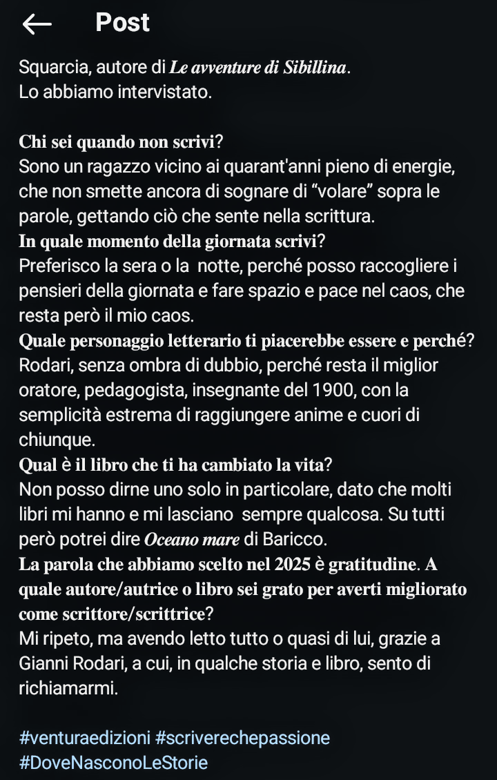 Nato nel Parco dei Monti Sibillini il 4 Agosto 1987, precisamente ad Amandola, fin da quando avevo pochi anni, leggo dapprima fumetti e poi libri sempre più impegnati. Mi diplomo in Ragioneria e conseguo poi la laurea in Economia del Territorio e del Turismo. Inizio nel 2011 un corso di scrittura creativa con il quale scopro una passione celata dentro di me e che va stimolata. I tanti libri divorati negli anni sono una fucina di creatività. Così scrivo. Partecipo con devozione ad una Antologia: “Il cerchio della memoria”. Un lavoro che grazie allo scrittore Vittorio Graziosi e agli altri compagni d’avventura, mi ha permesso di capire che questa passione andava resa ancor più viva e passionale. Partecipo a numerosi concorsi letterari in Italia, conseguendo anche alcuni riconoscimenti, oltre a dilettarmi nel giornalismo tramite magazine web. Nel frattempo lavoro ad alcuni componimenti, arrivando al traguardo del primo libro nel 2014. Ovviamente non sarà l’ultimo… Visualizza più articoli
